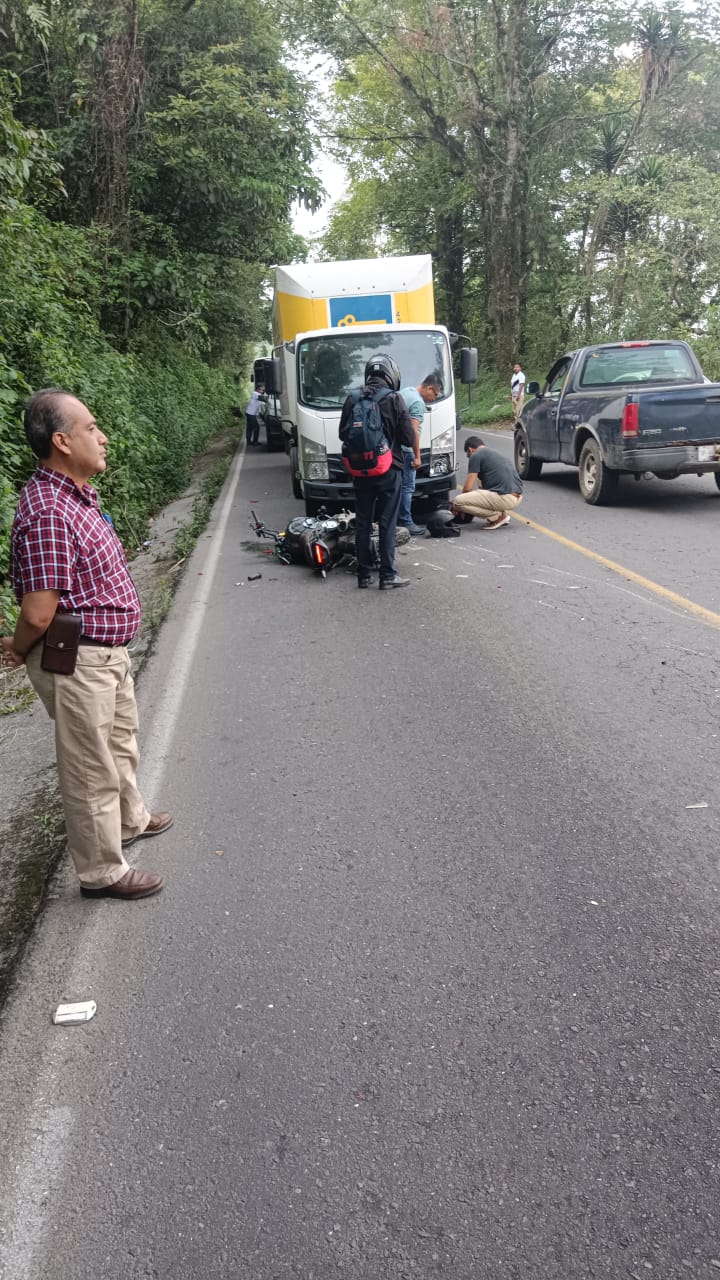 Tomatlán, Ver. – Esta mañana, en la carretera federal Conejos-Fortín, a la altura de la ermita de Tomatlán, una motocicleta impactó contra un camión de carga perteneciente a la tienda Coppel.