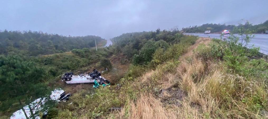 La unidad pesada descendía de las cumbres cuando el chofer, aparentemente por una falla mecánica, salió de la carretera y cayó hacia el vacío, muriendo el conductor prensado dentro de la cabina.