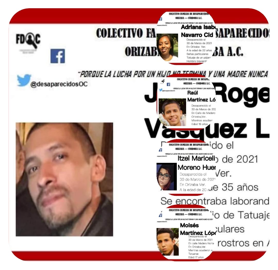 Este martes se dio a conocer la presunta desaparición de los hermanos Moisés y Raúl Martínez López, de 17 y 19 años respectivamente; José Rogelio Vázquez de 35 años; Adriana Isabel Navarro Cid, de 22 años de edad, así como Itzel Mariceli Moreno Huerta, en un negocio de tatuajes.