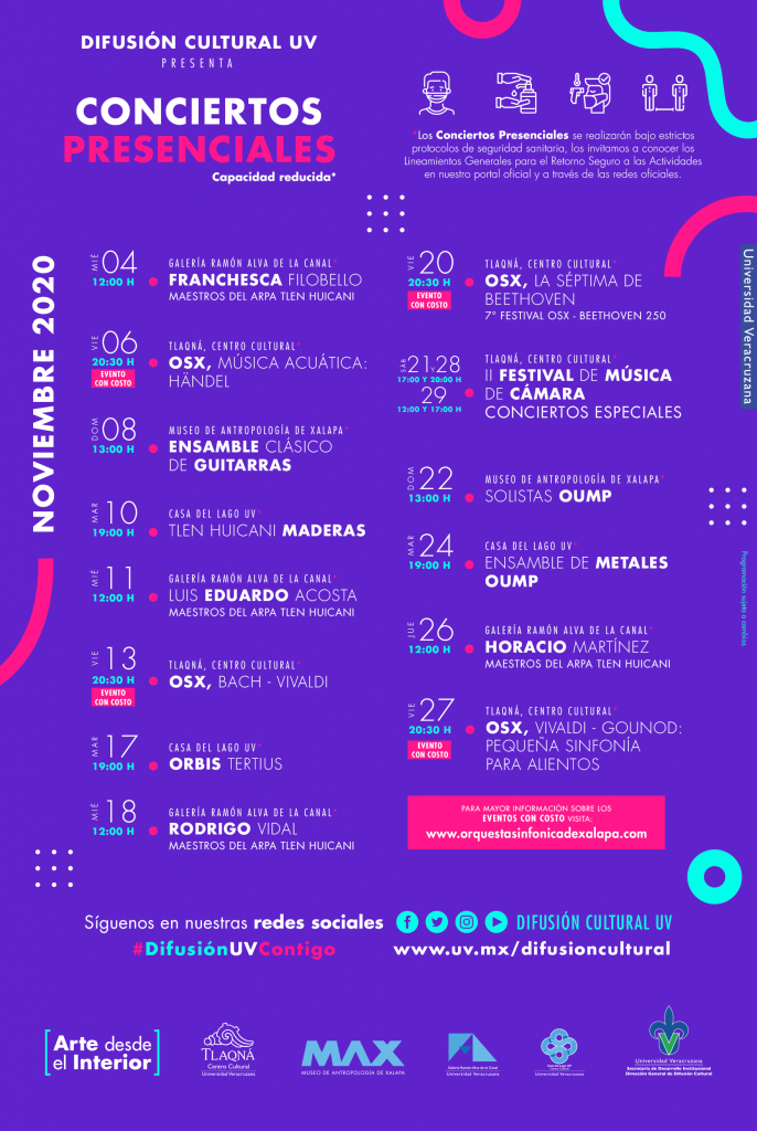No te pierdas la serie de conciertos presenciales y cápsulas didácticas que Difusión Cultural trae para ti en la cartelera del mes de noviembre, comparte la música y la alegría del Talento UV visitando las páginas de Facebook, Twitter, YouTube para conocer las medidas necesarias para el acceso a los conciertos presenciales y visita la plataforma DGDC MÚSICA en donde encontrarás más contenido.