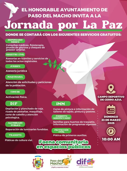 Paso del Macho, Ver.- Este domingo, el Ayuntamiento de Paso del Macho, encabezado por la alcaldesa María de los Ángeles Vázquez Vázquez, llevará a cabo la primera Jornada por la Paz en la comunidad de Cerro Azul.