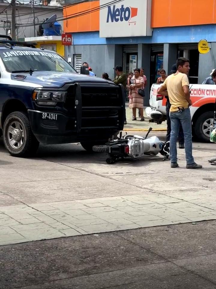 Paso del Macho, Ver.- La mañana de este lunes se registró un percance vial en pleno centro de la ciudad, luego de que una patrulla impactara a una motocicleta sobre la avenida Madero, entre la calle Sánchez Loyo.