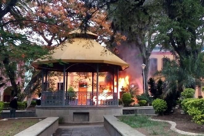 Tras acusar a la Policía Municipal de la violencia en la región, un grupo de habitantes incendió una patrulla de la corporación local y también vandalizó la fachada de la Presidencia Municipal.
