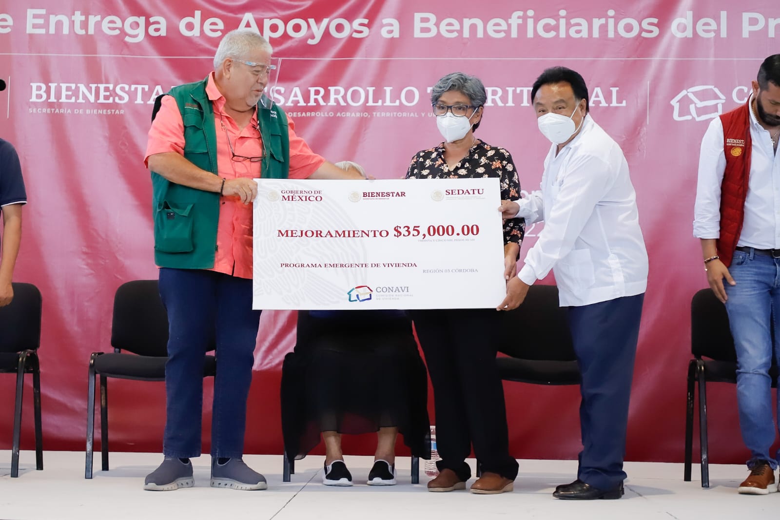 Córdoba, Ver.- El Presidente Municipal, Juan Martínez Flores, acompañó este día al Delegado de Programas para el Desarrollo en el estado, Manuel Huerta Ladrón de Guevara, a la entrega de apoyos a las y los beneficiarios cordobeses del programa “Emergente de Vivienda”.