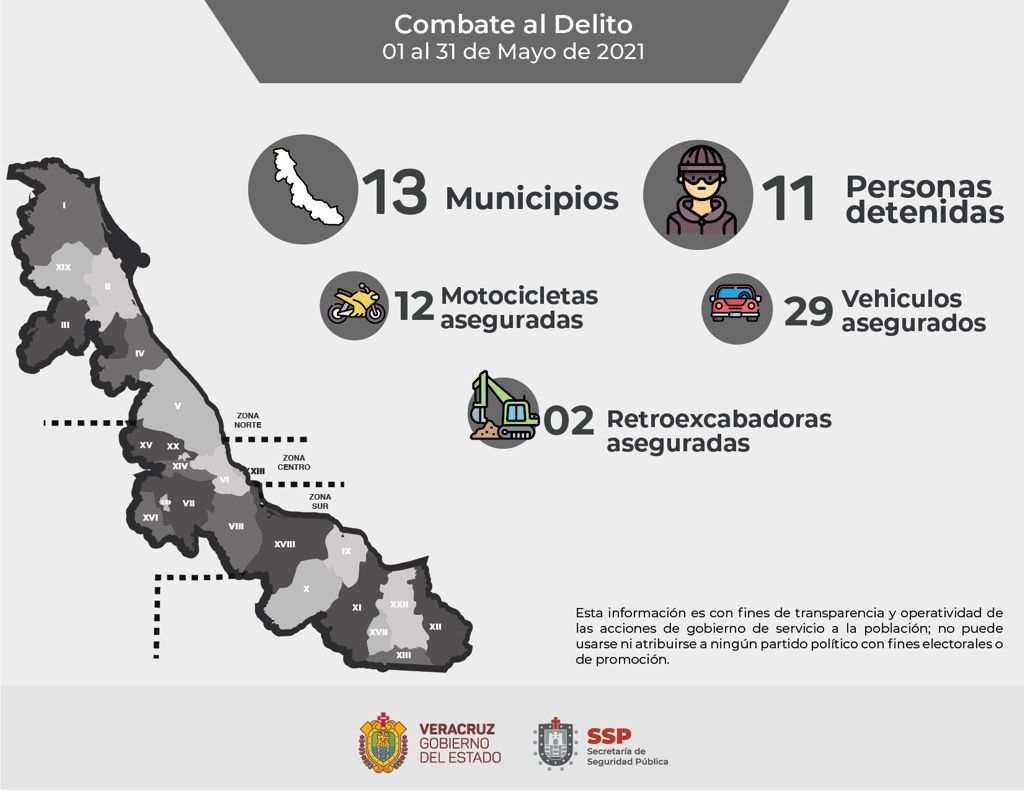 Las unidades recuperadas (29 vehículos, 2 retroexcavadoras y 12 motocicletas) fueron localizadas en Agua Dulce, Coatzacoalcos, Isla, Ixhuatlán del Sureste, Jáltipan, Juan Rodríguez Clara, José Azueta, Las Choapas, Minatitlán, Nanchital, Playa Vicente, San Andrés Tuxtla y Uxpanapa.