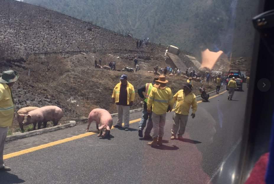 El accidente ocurrió sobre el kilómetro 242 en la zona del trébol de Maltrata, cuando el conductor del tráiler perdió el control y terminó a un costado de la carpeta asfáltica y con los cerdos literalmente caminando sobre la autopista.
