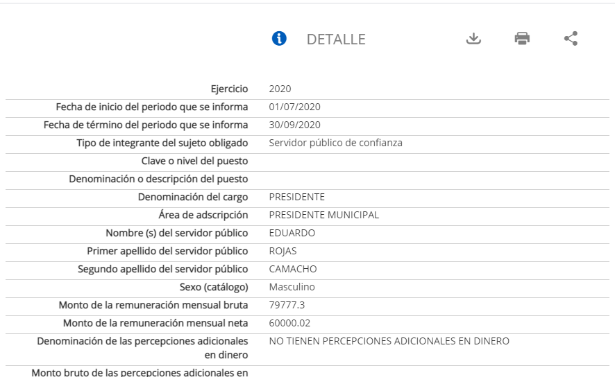 Rojas Camacho percibe una remuneración mensual neta de 79 mil 799 pesos.
