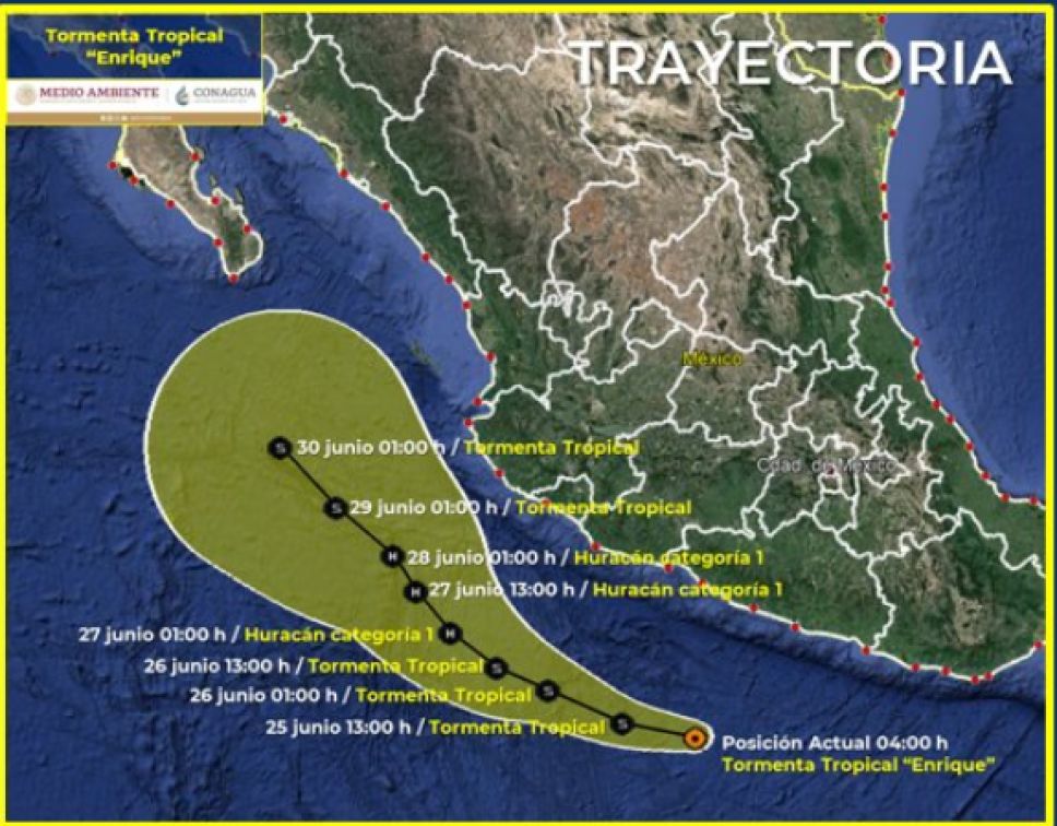 Ciudad de México. – Alrededor de las 4:00 horas de este 25 de junio se formó la tormenta tropical Enrique, frente a las costas de Colima, Michoacán y Guerrero y tiene potencia para evolucionar a huracán categoría 1 hacia el fin de semana, informó el Servicio Metereólogico Nacional (SMN) de la Conagua.