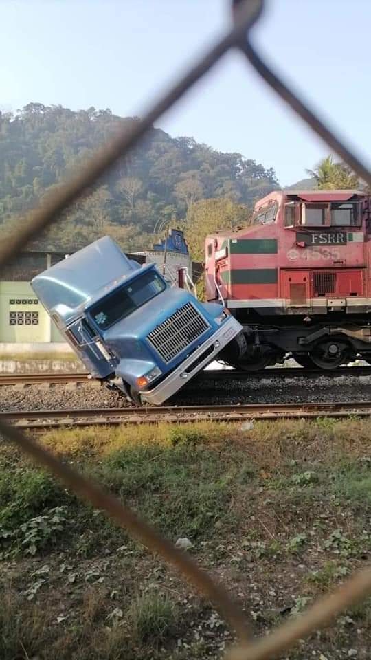 Tezonapa, Ver. – Un tren de carga arrastró a un tráiler cargado con maleza.