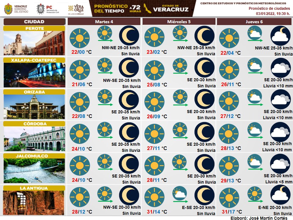 El viento será de componente Noreste, Este y Sureste con velocidades de 20 a 30 kilómetros por hora (km/h).