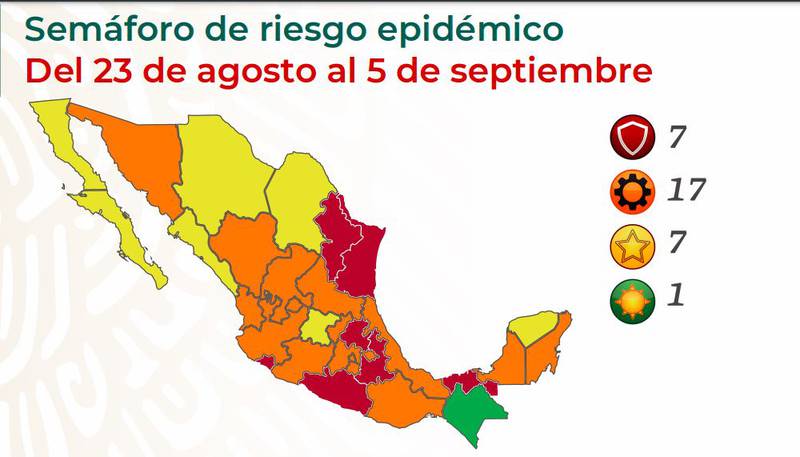 Este semáforo de riesgo epidémico por COVID-19 estará vigente del 23 de agosto al 5 de septiembre.