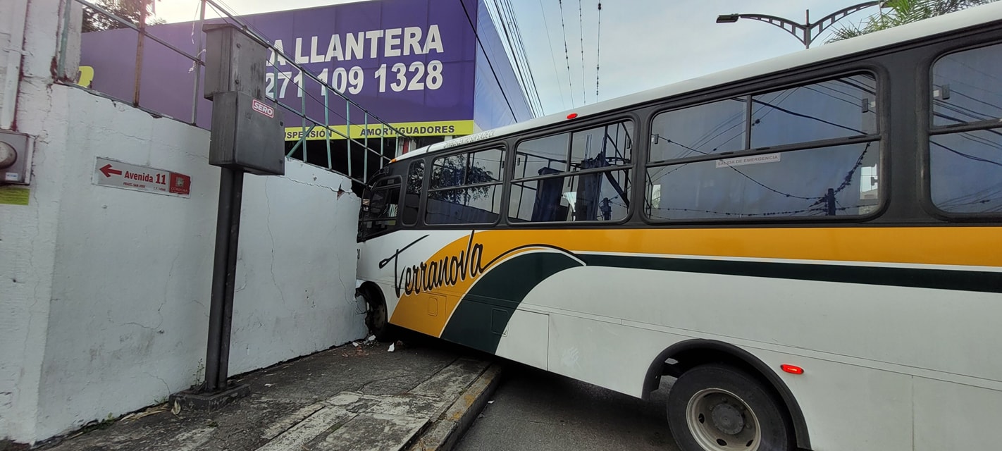 La unidad de servicio urbano impactó al vehículo particular y posteriormente se incrustó en una barda de un negocio.