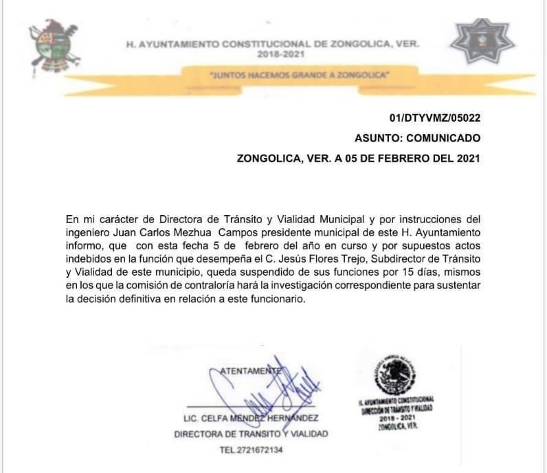 Lo anterior lo dio a conocer la directora de Tránsito y Vialidad, Celfa Méndez, por instituciones del alcalde Juan Carlos Mezhua Campos, ya que este tipo de situaciones no se van a tolerar y serán sancionados, es de recordar que este no es el único escándalo de Flores Trejo.