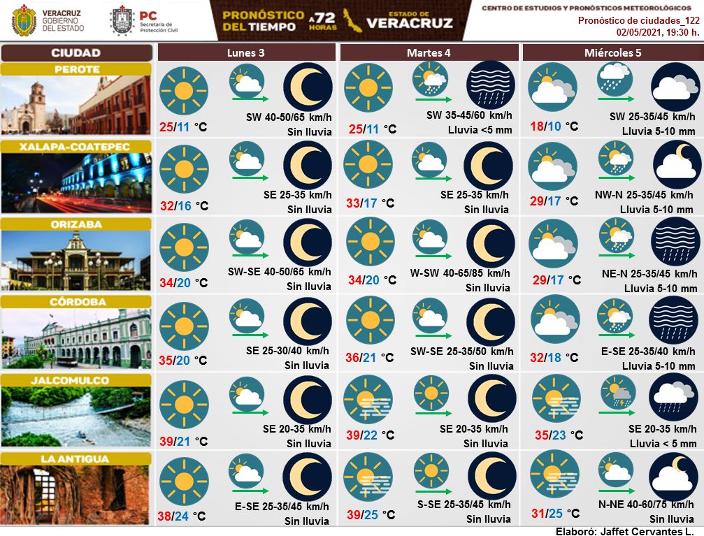 En tanto, se esperan de 50 a 75 kilómetros por hora de viento del sur en la región de Orizaba y valle de Perote, menores en la costa norte.