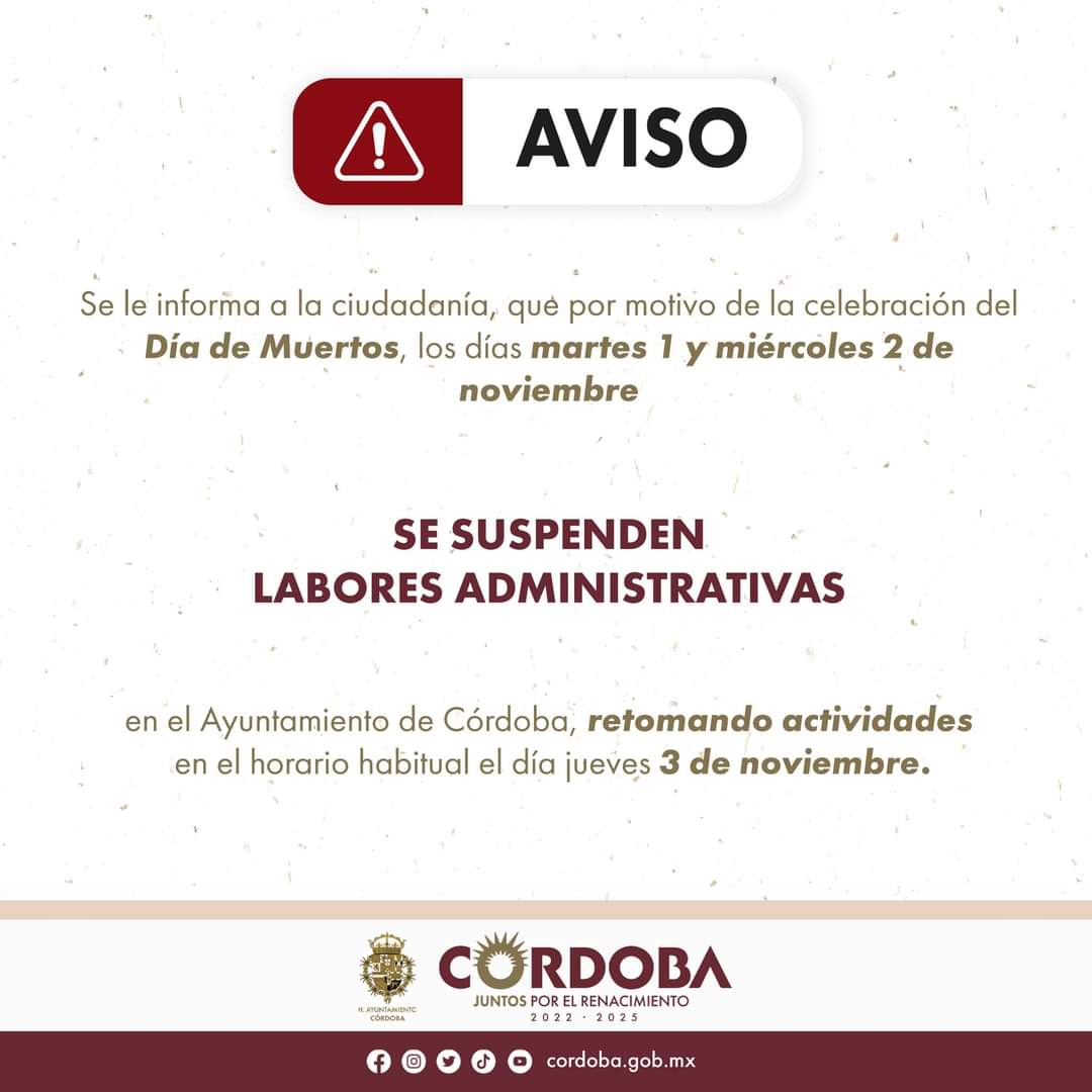 Córdoba, Ver. – Este 1 y 2 de noviembre, el Ayuntamiento de Córdoba suspenderá labores administrativas, sin embargo, la Limpia Pública trabajará con normalidad.