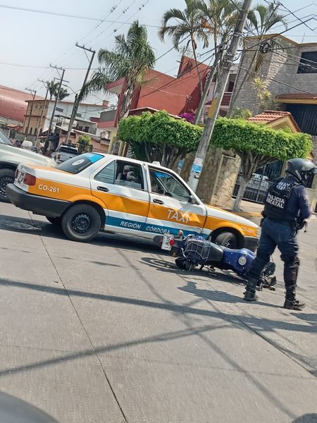 Córdoba, Ver. – En un incidente reportado en tiempo real, se ha registrado un percance vehicular entre un taxi de servicio público Nissan-Tsuru con número CO-261 y un motociclista.