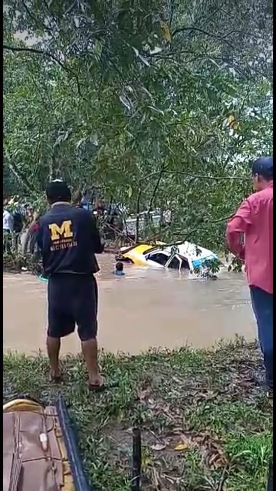 Testigos dijeron que el taxista de la unidad CO-350 del sitio ADO, en Córdoba, intentó cruzar el río El Suspiro, sin embargo, fue arrastrado por la corriente y su auto quedó prácticamente bajo el agua.