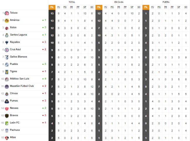 Se mantienen imbatibles en casa con cuatro triunfos, pero los mismos fueron cosechados ante San Luis, Juárez, Puebla y Querétaro, mientras que de visita no han podido ante Santos y ante Monterrey.Cruz AzulLos de Juan Reynoso han mostrado un crecimiento paulatino en la campaña, a pesar de lidiar con problemas extracancha.