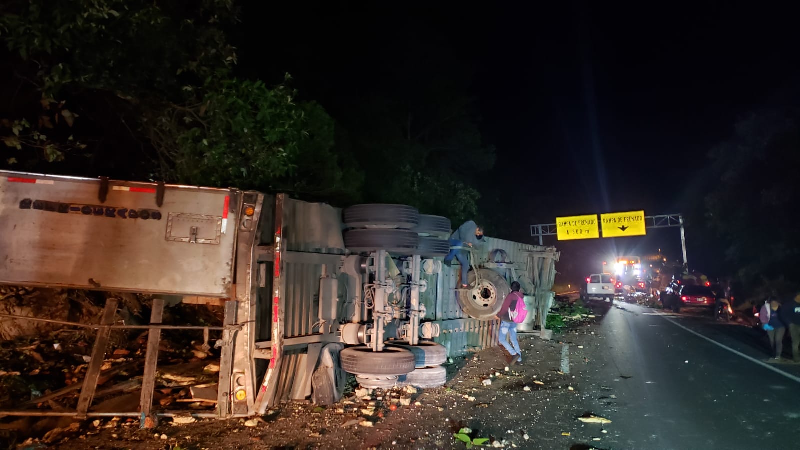 Debido al fuerte impacto, el hombre falleció mientras que la unidad quedó volcada y la carga regada sobre la carretera.