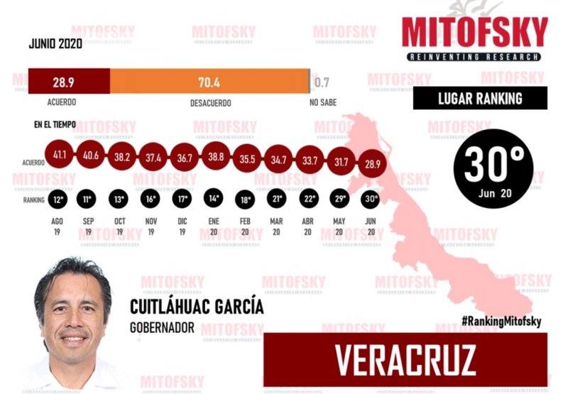 Xalapa, Ver.- De acuerdo con los resultados de una encuesta realiza por Mitofsky, el gobernador de Veracruz, Cuitláhuac García Jiménez, registra una baja aprobación, esto de...