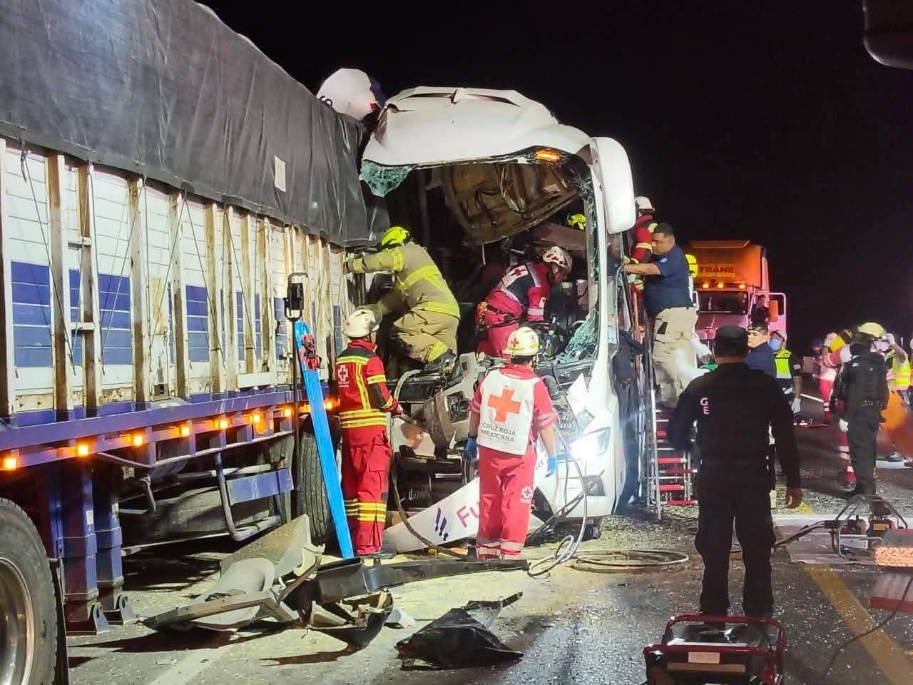 El accidente ocurrió durante la madrugada, cuando la unidad, procedente de Nuevo Laredo y con destino a Poza Rica, Veracruz, colisionó contra un tráiler detenido sobre la cinta asfáltica, lo que provocó severos daños en la parte frontal del autobús.