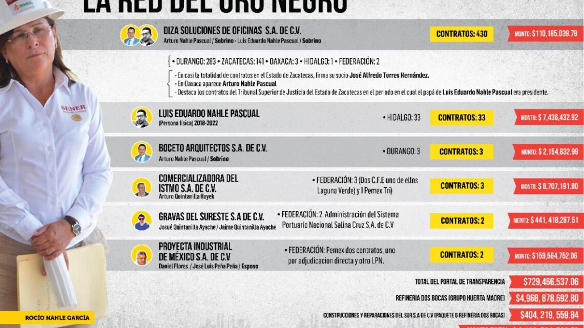 A los grandes contratos otorgados a compadres de la secretaria de Energía Rocío Nahle en el sector, se suman 430 obtenidos por varios de sus sobrinos y esposo por 730 millones de pesos lo que les significó un crecimiento de casi dos mil por ciento en su facturación en tan solo tres años