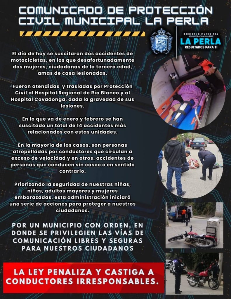 La Perla, Ver.— Luego de que ayer se registraran dos accidentes de motocicleta que dejaron lesionadas a dos mujeres de la tercera edad, autoridades municipales advirtieron que reforzarán los operativos viales y aplicarán sanciones contra conductores irresponsables.
