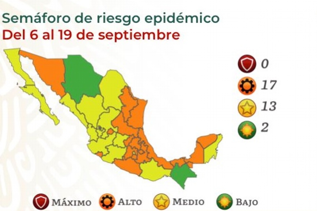 Asimismo, la dependencia dio a conocer que del 06 al 19 septiembre habrá 17 estado en semáforo naranja, 13 en amarillo de riesgo medio y 2 en verde de riesgo bajo.