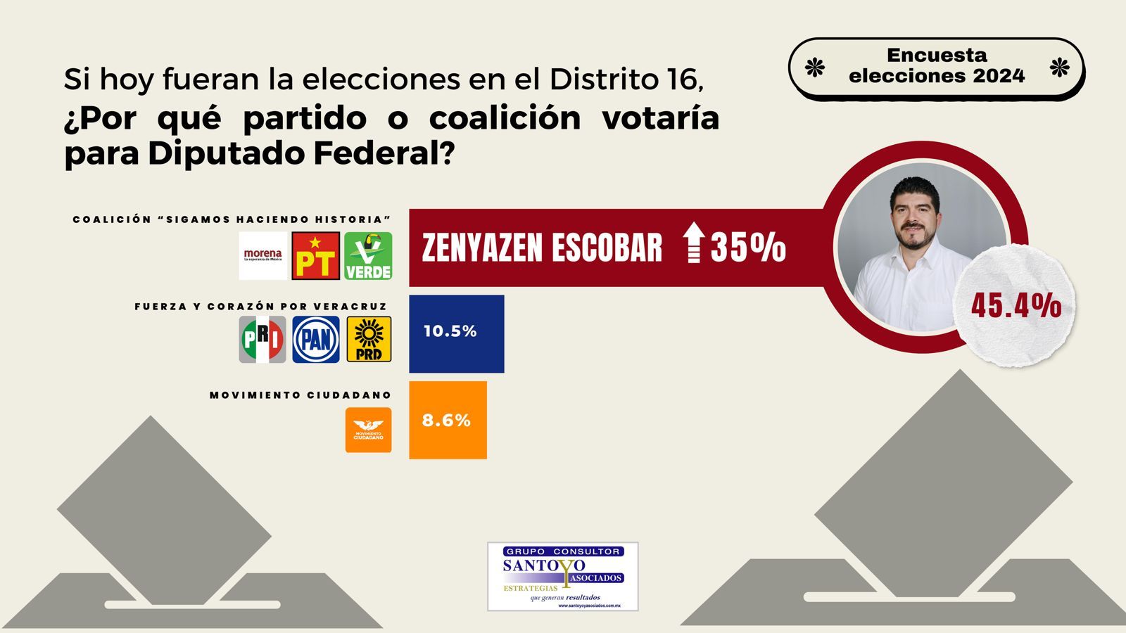 Del mismo modo, considerando el respaldo de la coalición “Sigamos Haciendo Historia”, Zenyazen Escobar obtiene el 45.4 por ciento de la preferencia del electorado, en tanto que los candidatos de la alianza “Fuerza y Corazón por México”, Adrián Pérez Croda, y el candidato de Movimiento Ciudadano, Emilio Sacre, solo consiguieron el 10.5 por ciento y 8.6 por ciento, respectivamente; dejando claro que el triunfo sería para el morenista de continuar esta tendencia.